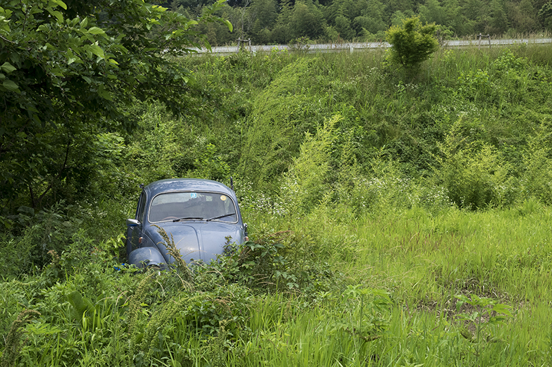 万緑の6月、第33番延命山菊水寺へ向かう途中、草に埋もれたフォルクスワーゲンを見つけた。塗装などはそれほど傷んではいない。どんな人が捨てたのだろう。2014年6月21日撮影 OLYMPUS E-M1 M.ZUIKO DIGITAL ED 12-40mm F2.8 PRO f.5.6 1/1000 ISO400