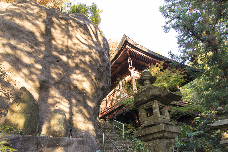 第26番万松山円融寺の奥の院岩井堂は、300段ほどの石段を息を切らせて登った上にある。規模は小さいが清水寺のような舞台造りのお堂だ。夕日が巨岩に木々が影を映し出す。2013年11月24日撮影 NIKON D600 AF-S NIKKOR 24-70mm f/2.8G ED f.3.5 1/125 ISO800