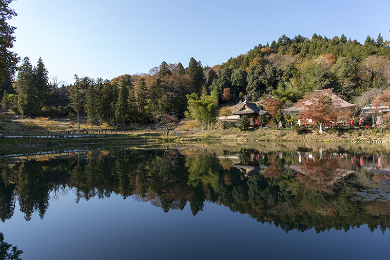 弁天池の向こう岸に見えるのが第25番岩谷山久昌寺の本堂。静かな池の面に紅葉の山が写る。2013年11月24日撮影 NIKON D600 AF-S NIKKOR 24-70mm f/2.8G ED f.4 1/800 ISO320