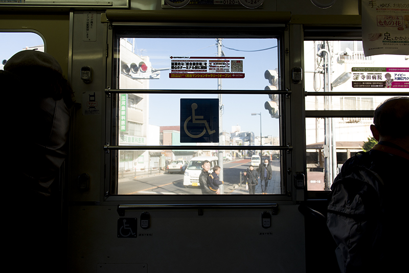 第1回は、「東京の町を移動しながら撮ってみる」というテーマ。都電荒川線を貸し切って、その中から撮るという趣向です。都電の車内という狭い空間に拘束されつつ、これまで撮ってきた既成のパターンを脱してどんどんシャターを切れ、とのアドバイスを受けて貸し切りの都電に乗り込みました。メンバーには講師も知っているようなアマチュアカメラマンや自信満々の真っ赤なブレザーのおじさん、中年、高齢の女性たちなど多彩というか、予想通りというか・・・。